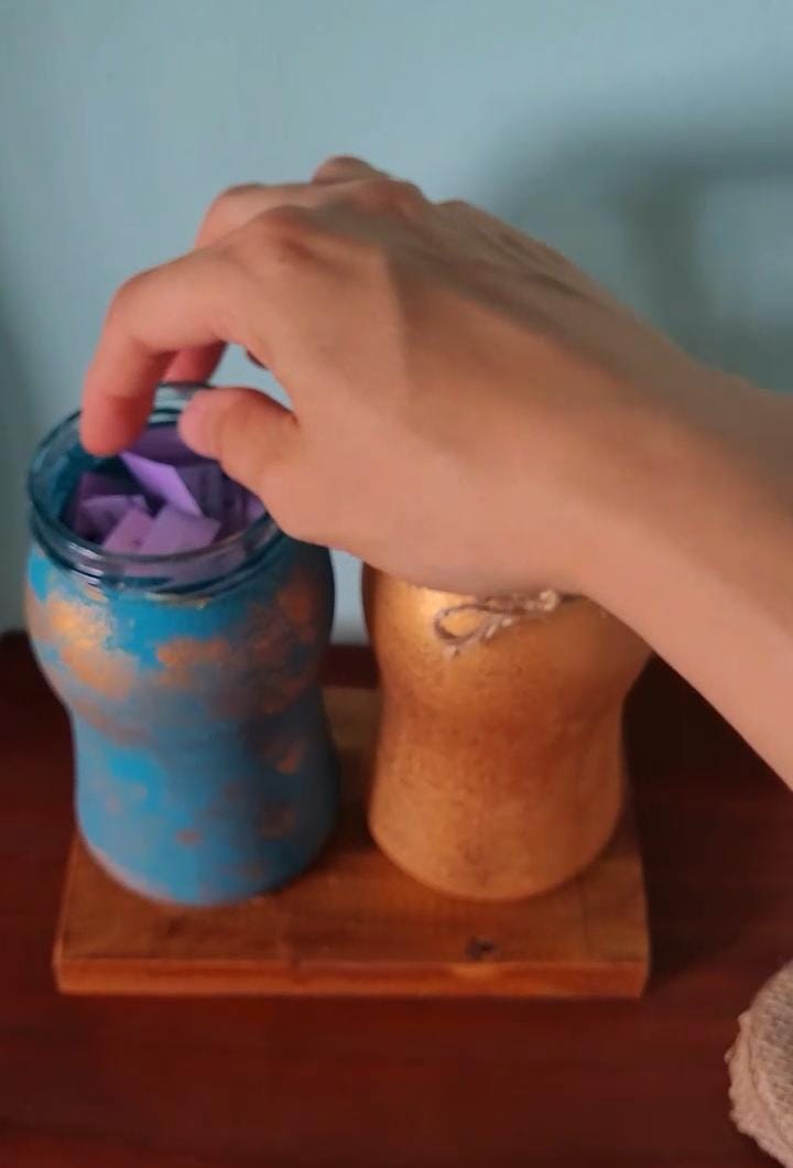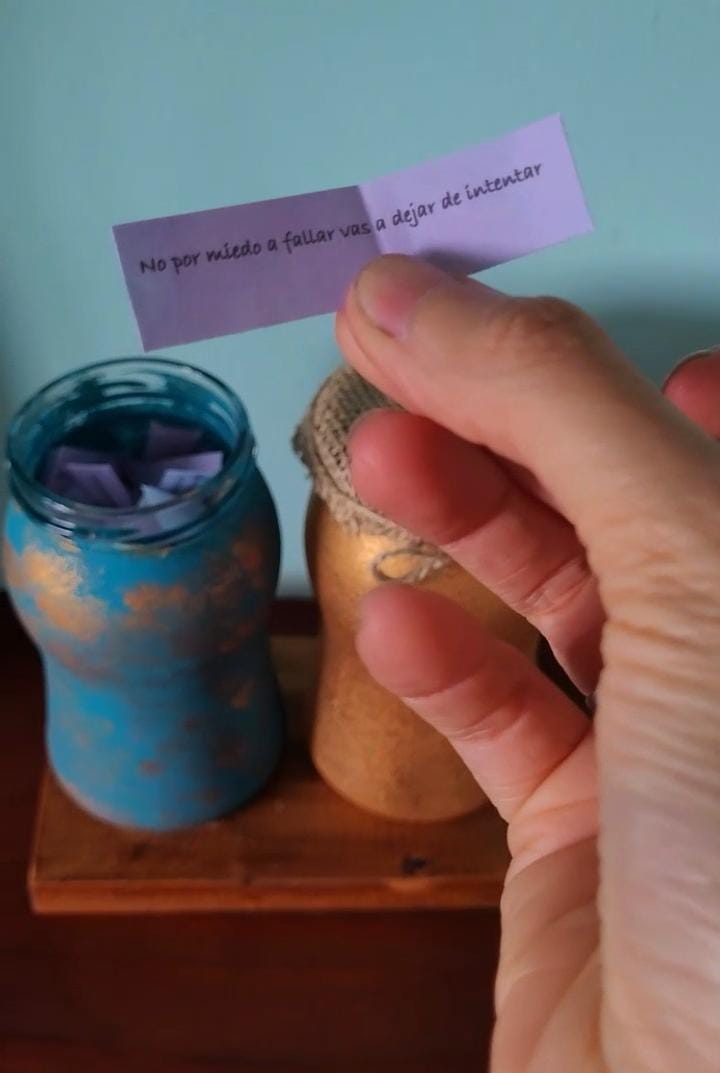 Este es un regalo super original, ideal para regalar en cumpleaños o en año nuevo ya que dentro de este frasco decorado a mano, tiene 365 frases cortas, motivadoras y llenas de fe, las cuales podes leer una por dia, sacandolas al azar y recibiendo cada día un mensaje diferente.